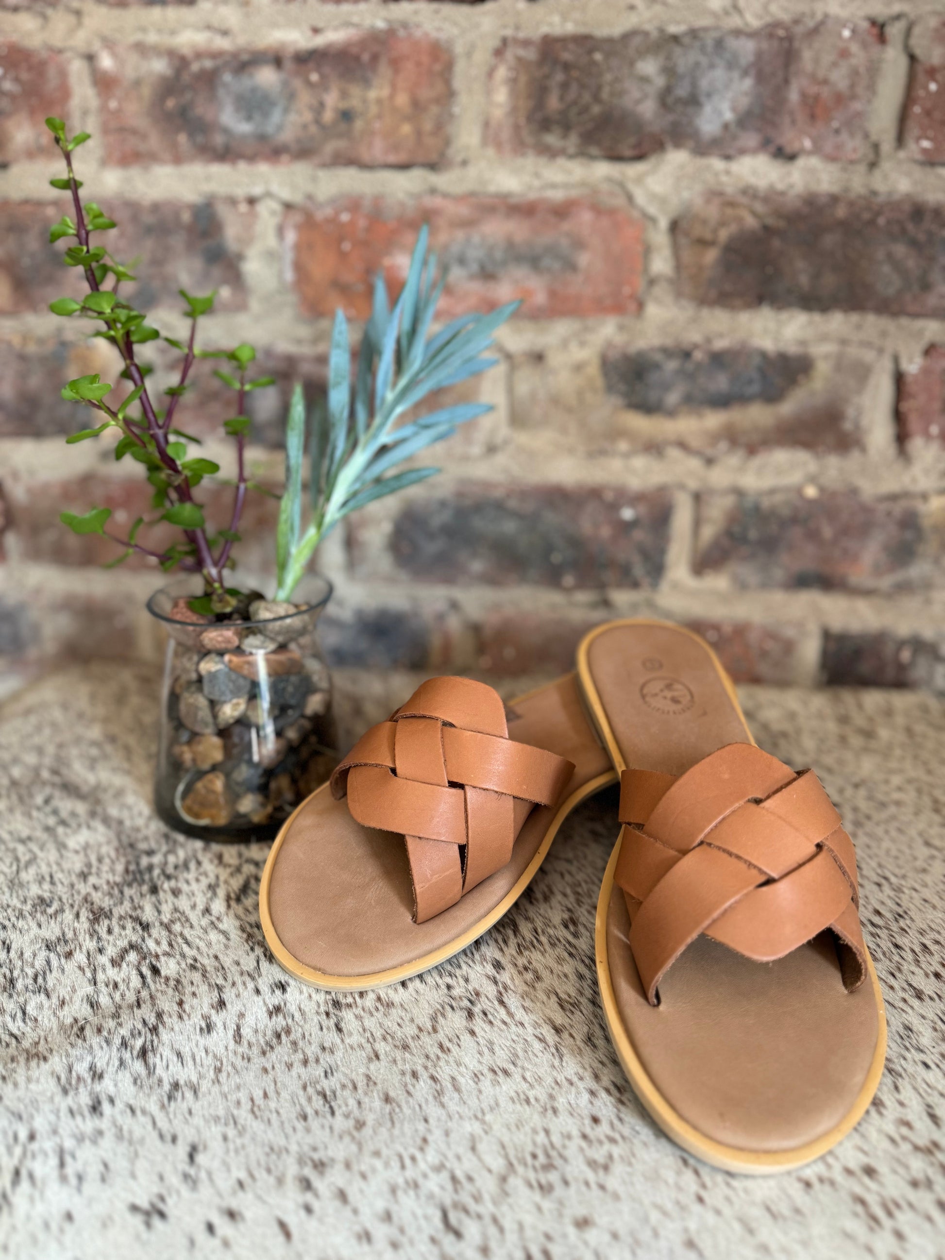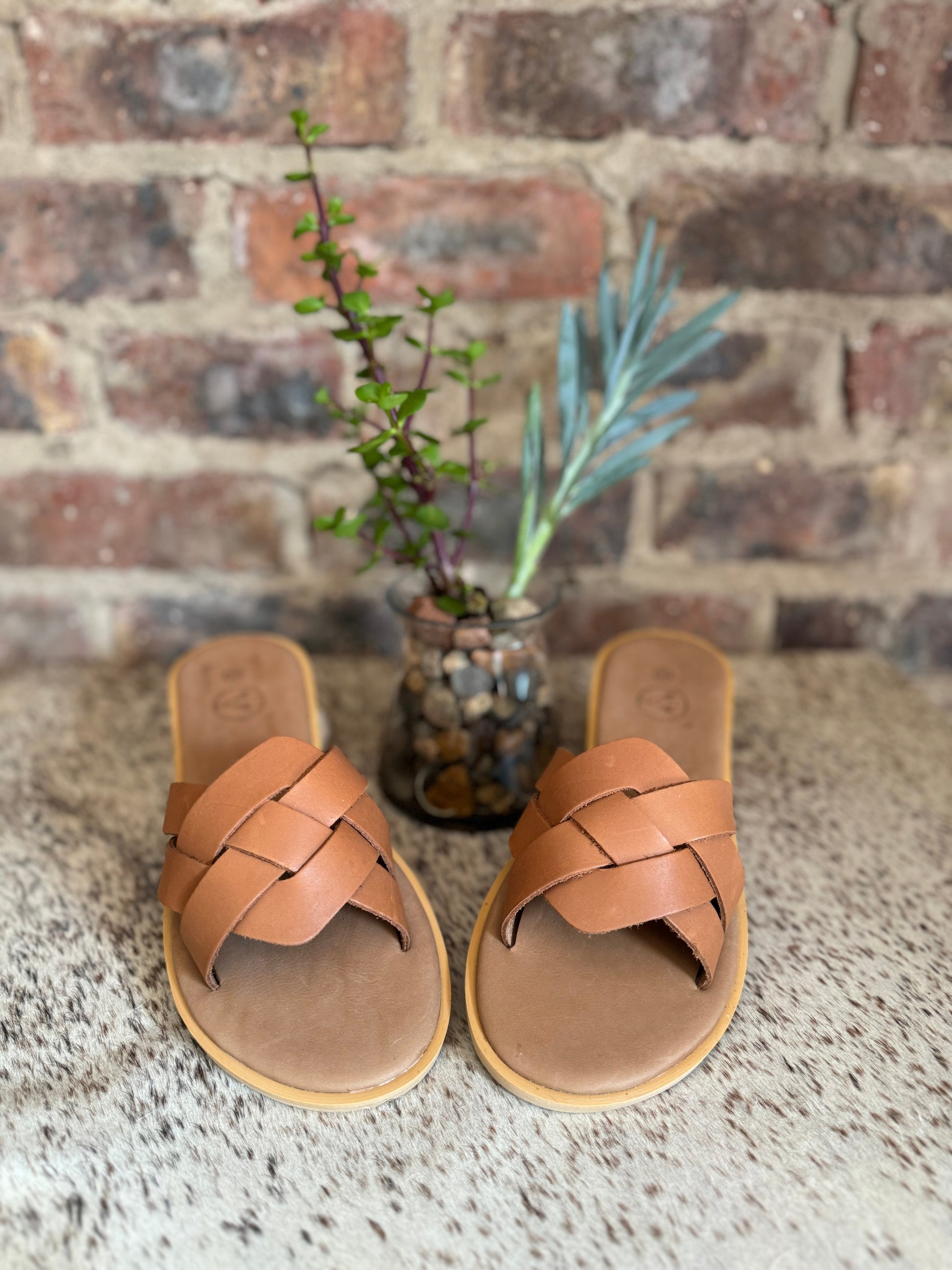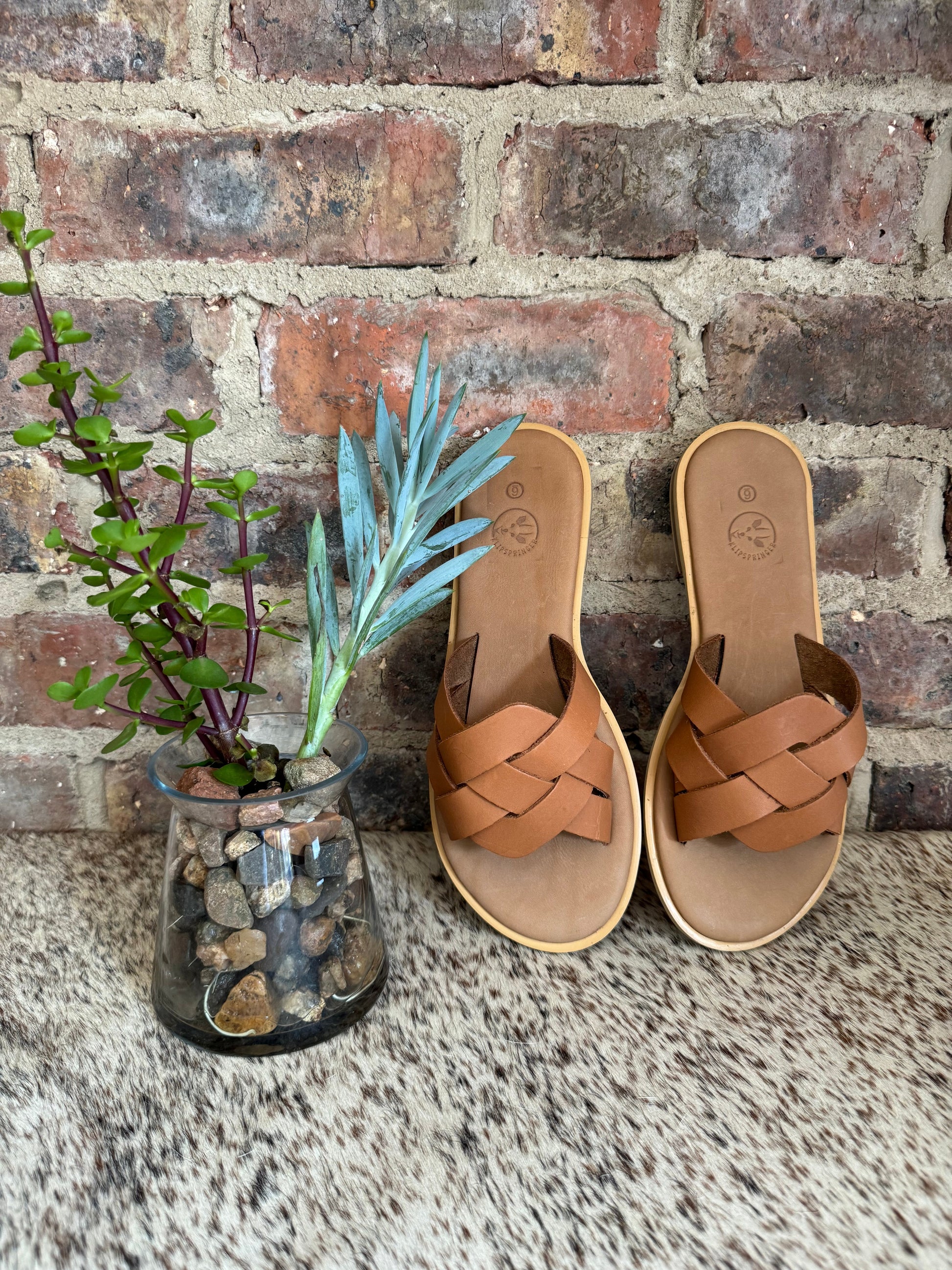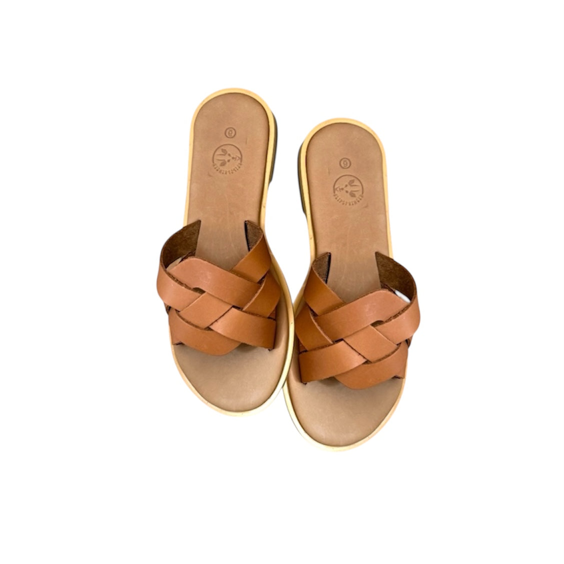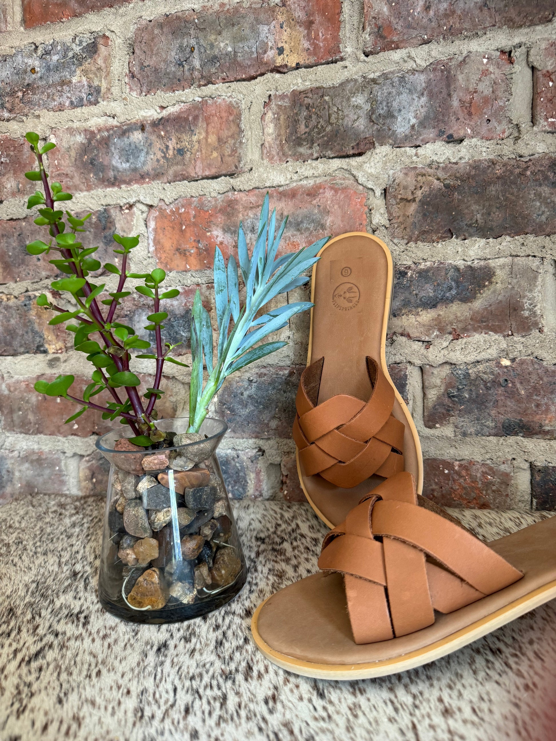 The Lala is an Atlanta tan leather sandal with a leather insole and memory foam footbed.